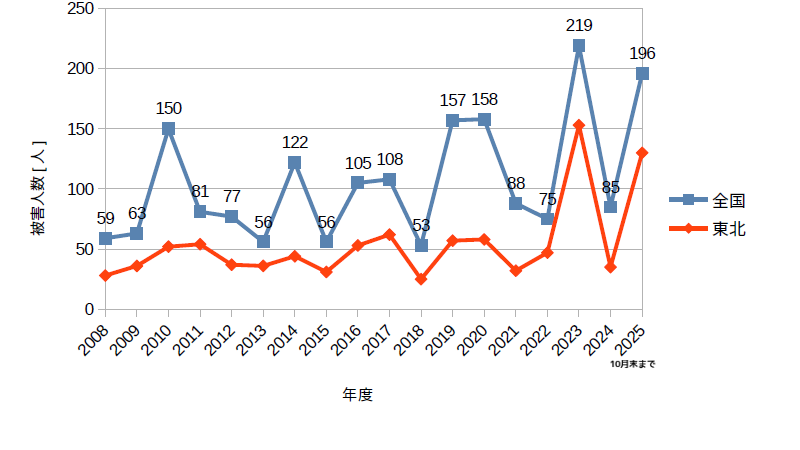 9月末までの全国の被害人数が108人、東北6県61人、秋田県19人だったので、10月に入ってから倍増している。10月末までで全国196人、東北6県130人。特に秋田県が56人に激増している。