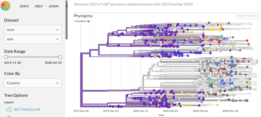 下図はDatasetでアジアに絞った場合。上の系統樹の図と色が対応。