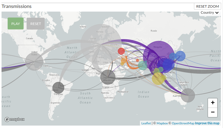 画面左のDatasetで地域を絞ったり、Data Rangeで期間絞ったり、系統樹の枝をダブルクリックするなどして、いろいろみれる。