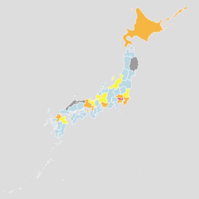 赤色:感染者500人以上、橙色:100人以上、黄色:30人以上