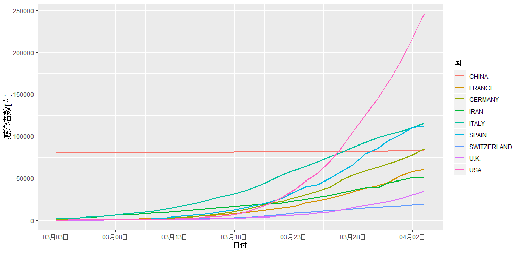 アメリカは3月20日頃から急増して現在24万人超。イタリア、スペインが緩やかに見えてしまう程異次元。しかも今後1-2週間続く可能性がある。