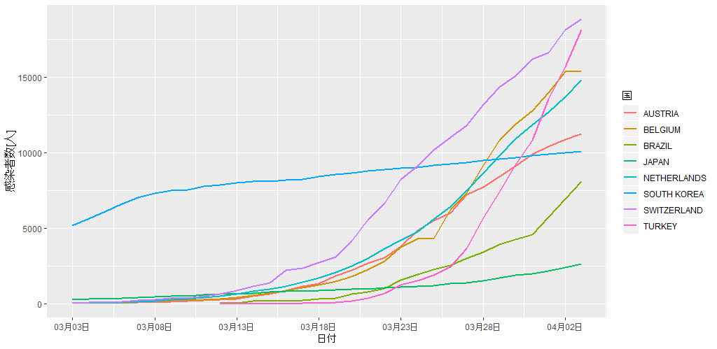 感染源だったチャイナや2番目に感染拡大したカンコクでは横ばいに近い状態で推移しているが、日本以上に世界中の国々との往来が絶たれていたため、かえってヨーロッパからの第二波が入りにくくなっているのだろう。