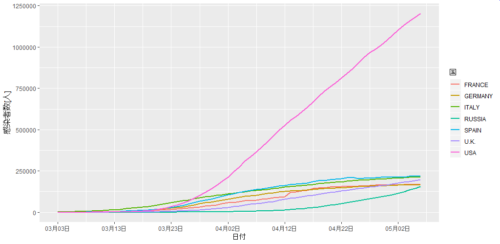 アメリカが相変わらず異次元。大きな国とはいえ毎日2万人超増えて2週間どころか1ヶ月以上増え続けている。