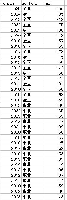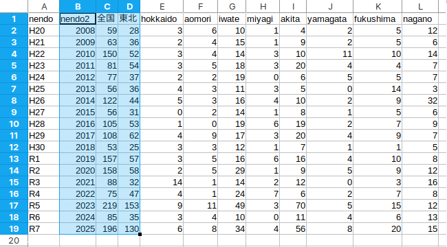 一例としてクマ(熊)による被害のデータ。環境省HPから値入力 ⇒ データファイル kumahigai2025-ex.csv。