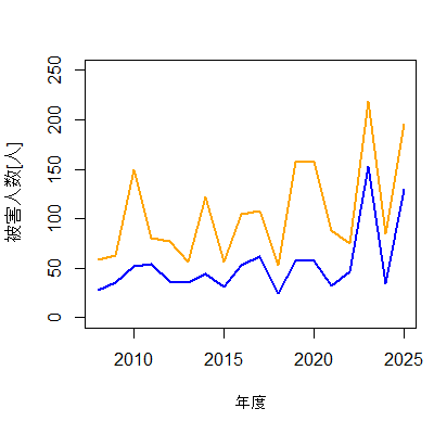 plot(data[,2],data[,3],type="l",lwd=2,col="orange",ylim=c(0,250),xlab="年度",ylab="被害人数[人]")