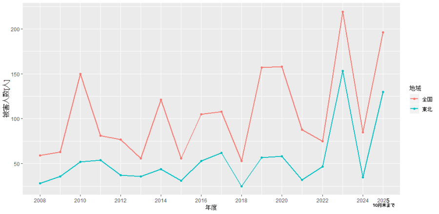 kuma <- kuma + labs(x="年度", y="被害人数[人]", colour="地域")