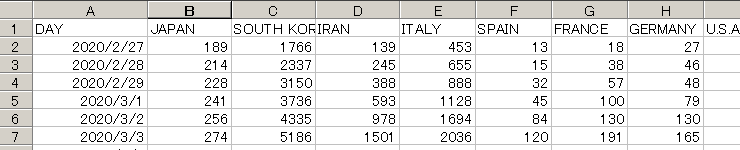 1列目(DAY)の日付(2020/3/1など)は、Date型に変換しておかないと順序がおかしくなる。