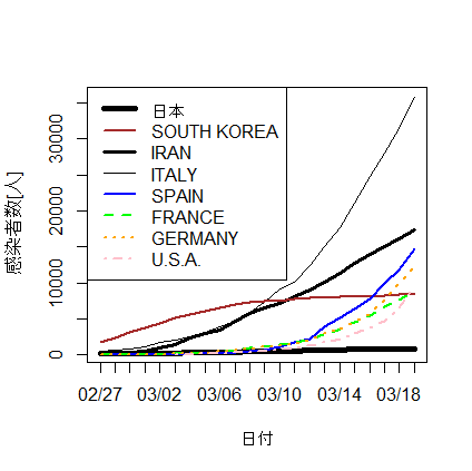 legend("topleft",c("日本","SOUTH KOREA","IRAN","ITALY","SPAIN","FRANCE","GERMANY","U.S.A."),
