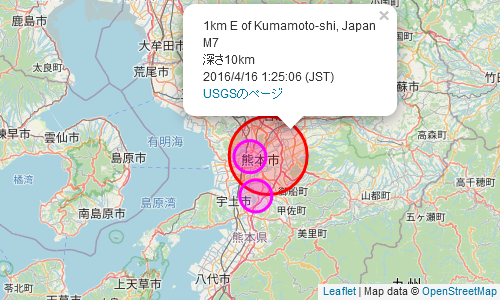 Leafletでプロットした地図の熊本のポップアップが下。